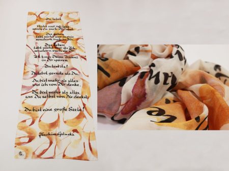 Poesietücher ICH UND DU UND WIRIch und Du und Wir sind lebendige Wesen. In jeder tieferen Begegnung können wir das Leben spüren, wie es gerade anwesend ist, wie es sich entfaltet, wie es tanzt und lacht und weint und schimpft, wie es Angst hat, einsam ist und sich verliert, wie es sich wiederfindet, aufwacht und der Liebe folgt, wie es Schönes und Schreckliches erlebt, leidet und glücklich ist und irgendwann wieder stirbt, wie es als Ich lebt, als Wir und als alles, was lebt, wie es zu allem Leben dazugehört, zu allem, was atmet, was ein Herz hat, das schlägt, und was sein Dasein fühlt. Wir sind Leben inmitten von Leben. Joachim Galuska NACKT Flüchtig in die Welt geschenkt, Schoßgelöst zu erwachen – ein Lächeln sucht sinnlich berührt Unendliches in der Welt. Und nackt im Zwielicht findet sich die Seele, ihr Atemkleid weht in zärtlicher Schönheit. Und nackt im Morgenrot schenkt sich die Seele, ihr Hinaufdehnen küßt mit sanftem Innertief Dich. Und nackt im Ewigen tanzt die liebend geliebte Seele hier und jetzt in entfaltete Nächte und wirgefunden hindurch. Uta Galuska DU LEBST Nicht nur ich lebe, sondern auch Du lebst. Das Leben lebt nicht nur in mir, sondern auch in Dir. Das Leben lebt nicht nur als Ich, sondern auch als Du. Ich kann Deine Präsenz in Dir spüren. Du bist da! Du lebst gerade als Du. Du bist mehr als alles, was ich von Dir denke. Du bist mehr als alles, was Du selbst von Dir denkst. Du bist eine große Seele. Joachim Galuska In der Seele liefert der Schatten die Energie für das Licht. Finden, was wirkt. Das große Dunkel leuchtet. Bert HellingerDein transparentes Gewand schimmert das Ewige ins Gegenwärtige. Uta Galuska
